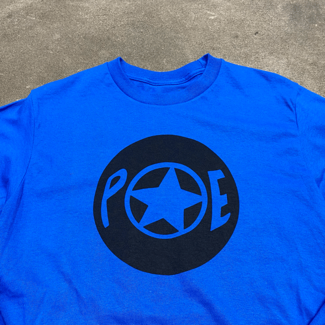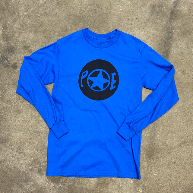 One off Poe print on a cozy royal blue 100% cotton long sleeve tee.