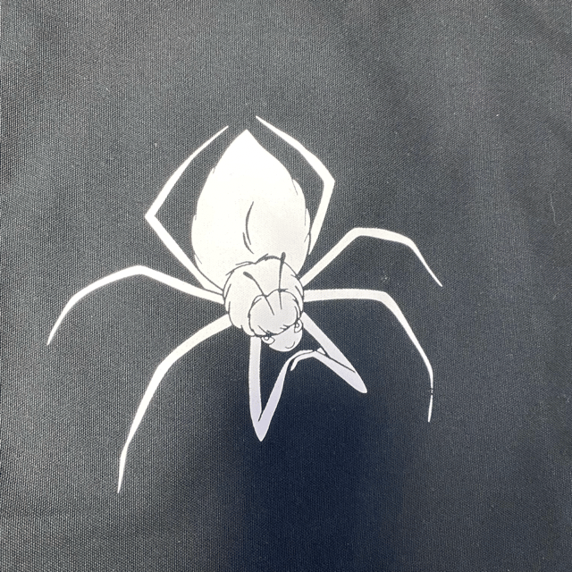 Screen printed on both sides of a 15" x 13" black tote with bottom gusset and extra long handles